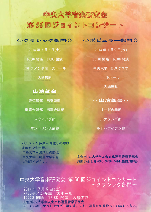 | ‘æ56‰ñ ’†‰›‘åŠw‰¹ŠyŒ¤‹†‰ïƒWƒ‡ƒCƒ“ƒgƒRƒ“ƒT[ƒg 2014.7.5 | J.Rutter "Birthday Madrigals"‚æ‚è <It was a lover and his lass> <Draw on, Sweet night> <Come live with me> <My true love hath my heart> <When daisies pied> | —é–Ø‰ël(Šw¶ŽwŠöŽÒ) | ƒsƒAƒm@’†‘º—¢ ƒx[ƒX@ƒTƒŠ[²“¡ | ƒpƒ‹ƒeƒmƒ“‘½–€‘åƒz[ƒ‹ | |
